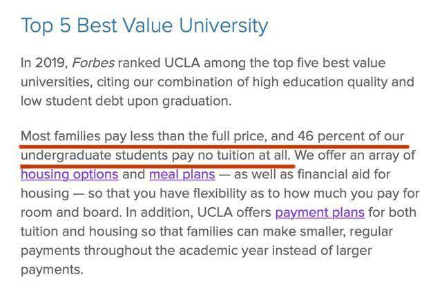 许多公立学校更是给予美国人极大的优惠。例如UCLA的本州居民学费仅为13239美元一年,仅占全额学费的1/3。更为夸张的是,根据学校官网的骄傲宣传,3万多名本科生中,有46%的人根本连一毛钱学费都不用付。