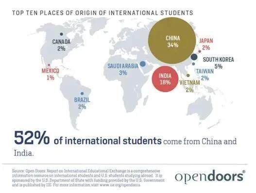 根据美国开放门户报告(Open Doors Report),2018-2019年期间,中国大陆仍旧是美国国际生第一大生源国,总留学生人数约为37万人,占美国国际生总数的33.7%。其中本科生有14余万人,研究生有13余万人。