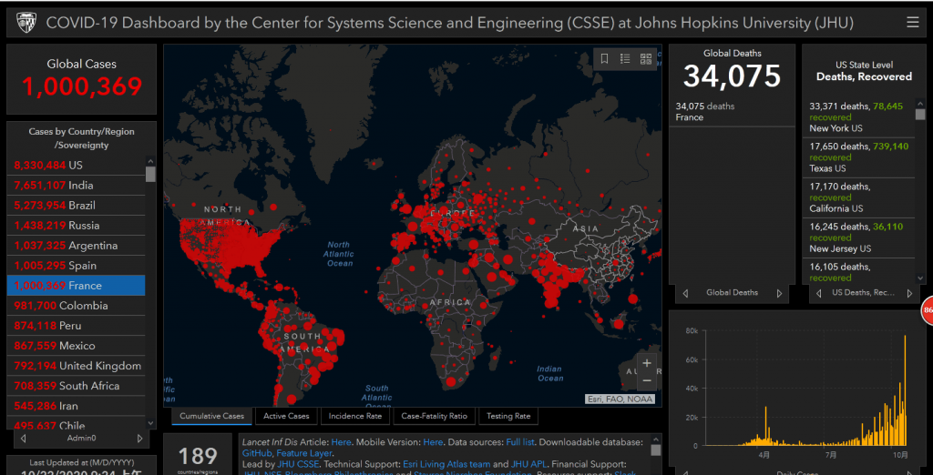 全球新闻 COVID-19 头条新闻 美国约翰斯·霍普金斯大学:法国新冠感染病例超过100万 编辑 孔 梦菲 - 2020年10月22日 美国约翰斯·霍普金斯大学:法国新冠感染病例超过100万 根据美国约翰斯·霍普金斯大学公布的实时疫情数据,截至北京时间22日9时24分,法国累计新冠病毒感染病例达到1000369例,其中死亡病例达到34075例。法国已成为继西班牙之后第二个新冠病例超过100万的欧盟国家。