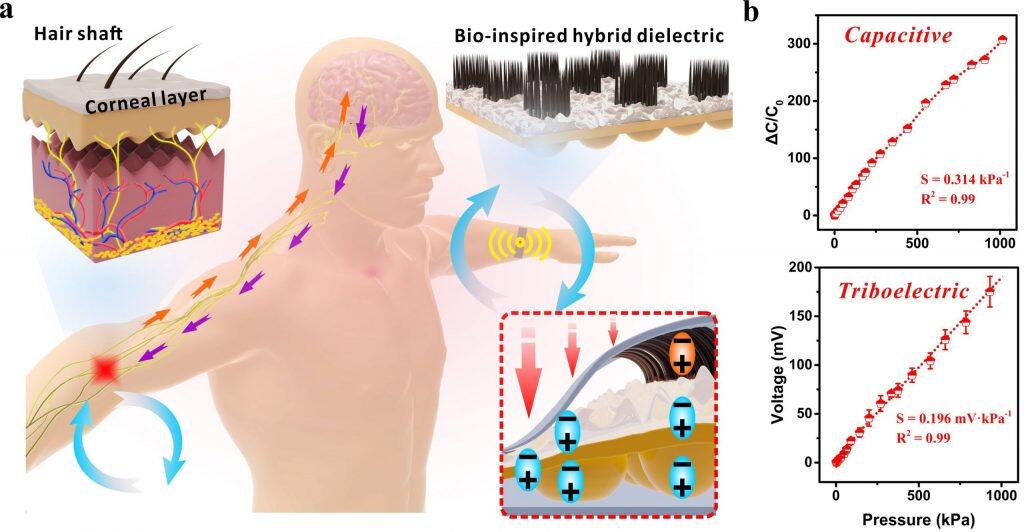 受人体皮肤结构的启发,研究团队设计出一种由低介电的微纤毛阵列和高介电的粗糙表面及微穹顶阵列构成的复合介电体。该复合介电体具有梯度式的介电特性和可压缩性,能够在不同压力作用下实现低、高介电组分的串并联转换,以满足介电性能和机械性能随压力的线性变化,从而实现了电容式传感器件在高达1000 kPa的超宽范围内维持线性工作及稳定的灵敏度。该复合介电体同样适用于摩擦发电式触觉传感器,其线性介电行为以及复合结构既可实现等效面电荷密度随压力的线性变化,又可增强接触起电及静电感应。因此,该传感器亦可作为一种自供电检测设备,在同样高达1000 kPa的超宽压力范围内,有效地将外力刺激线性地转换为电压信号,对人体的健康特征及体动等进行实时的监测。