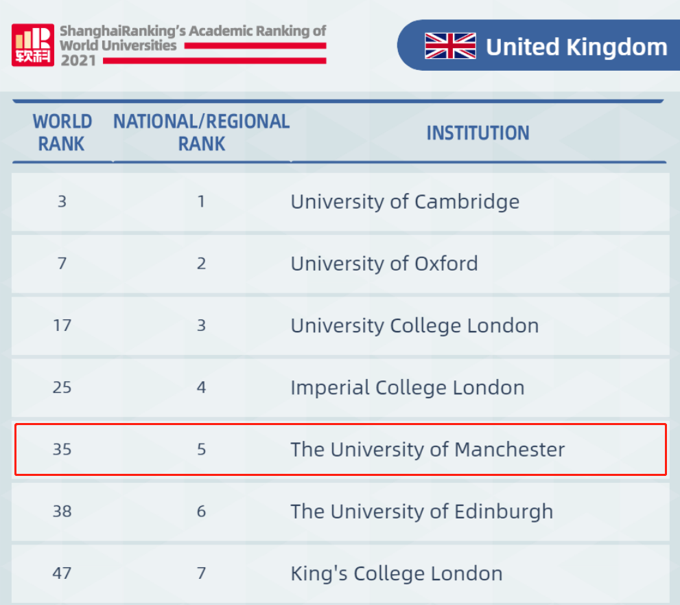 曼彻斯特大学在这一权威国际排名中,凭借雄厚的学术研究实力,再创佳绩,在英国大学之中保持英国前5强的领先地位,位列全球35位,较去年上升1位!