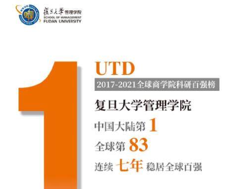 UTD最新发布2017-2021年全球商学院科研排名百强榜单,复旦大学管理学院位列全球第83名、中国大陆第一,连续7年进入全球百强。
