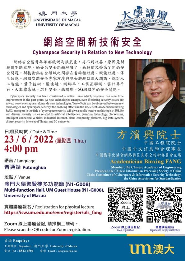 澳门大学将于6月23日(星期四)举办“大学讲坛”讲座,由中国工程院院士方滨兴担任讲者,就“网络空间新技术安全”为题发表演说,探讨新技术不断涌现下网络空间安全态势及其方方面面。