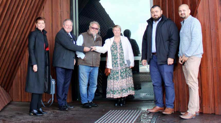 上图为墨累镇镇长Dean Unsworth和西澳州食品创新专区经理 Chris Vas博士,向莫道克大学代表食品科学与营养学专家Vicky Solah教授正式移交了食品研发大楼的钥匙。