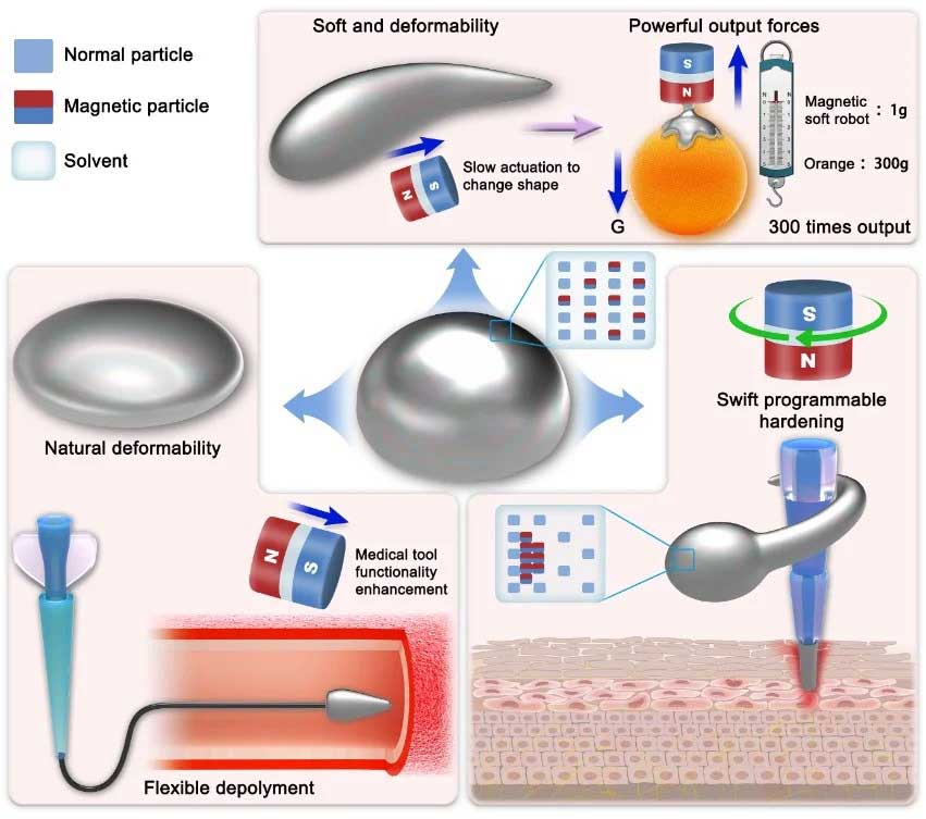 研究团队的实验结果表明,采用磁性颗粒和非牛顿流体软材料的混合物来制作磁控机器人可以实现可编程硬化、可控黏附、柔软可重构等特性。通过施加外部磁场,借助磁控机器人的黏附和磁驱动,重量1克的磁控机器人能够抓起自身300倍重量的物体。该磁控机器人可以黏附在各种物体的表面,赋予其磁性驱动的能力,从而提升操控性能。磁控机器人能够与传统手术机器人一起协同使用,为其提供精准的磁驱动导航和控制,以及提供更多样化的功能,包括黏附抓取等相关操作。此外,磁控机器人还可通过施加快速变化的无线磁场来激活当中的非牛顿特性,使其可以在流体和固体形态之间进行实时可控的切换,从而快速实现硬度切换。