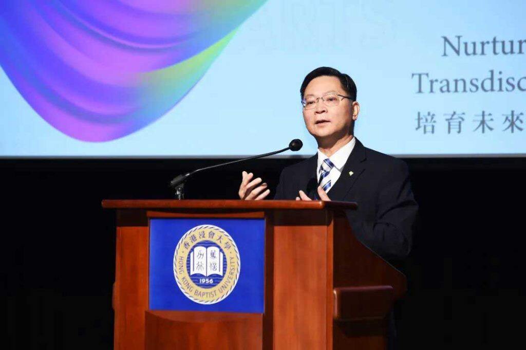 浸大校长卫炳江教授致辞时介绍大学的重点发展和创新项目,包括于2022年7月成立创意艺术学院、2022/23学年推出四个跨学科本科课程,以及预计于2024年落成的赛马会创意校园。