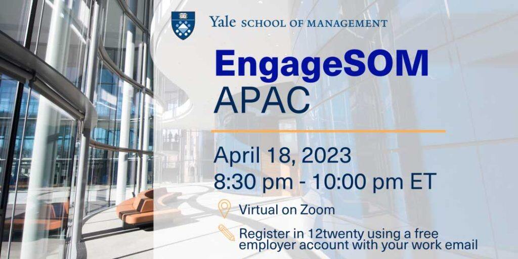 EngageSOM亚太地区线上活动是耶鲁管理学院为各个学位和毕业年份的学生们组织的专场招聘会。活动汇集了一批计划在亚太地区招贤纳士的雇主们,将通过在线小组讨论的形式进行。这有助于同学们了解雇主们的企业使命、影响力和提供的招聘岗位,从而获得全职/实习机会。