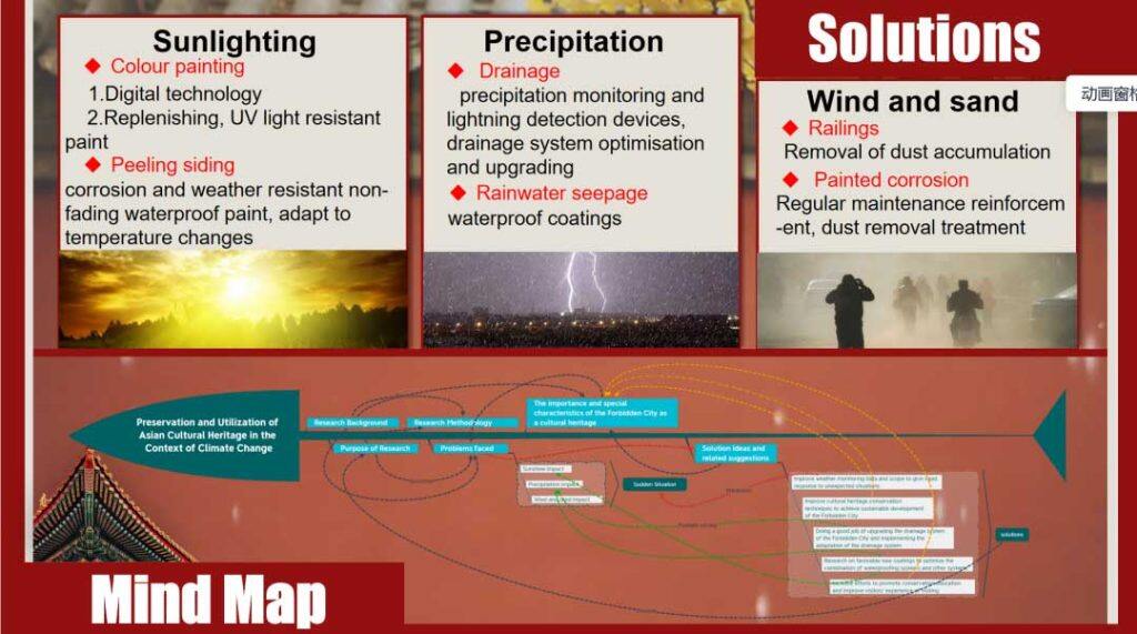 探秘故宫小组团队由旅游科学学院宋昌耀副教授担任指导老师,2020级旅游管理专业谭依依担任队长,成员包括2020级旅游管理专业刘欣怡、谷彤,2020级人文地理与城乡规划专业黄梓若,2021级旅游管理专业郑羽、刘博翾和海南大学2019级风景园林专业艾可。探秘故宫小组以故宫为案例地,经研究发现气候对于故宫的三类影响,并提出了四项针对性保护办法。