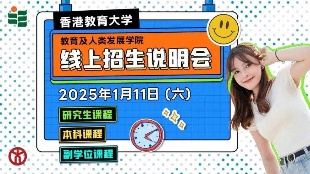 香港教育大学教育及人类发展学院将于2025年1月11日(星期六)上午10:00至下午4:00,通过腾讯会议平台举办普通话线上招生说明会,各位同学不要错过啦!