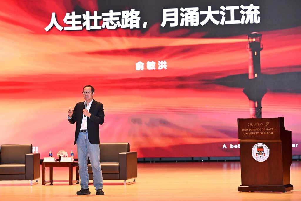 澳门大学于4月14日举办大学讲坛暨东望洋讲堂,由新东方教育科技集团董事长俞敏洪以“人生壮志路,月涌大江流”为题发表演讲,分享如何将挑战转化为成长动力、如何在逆境中保持定力。